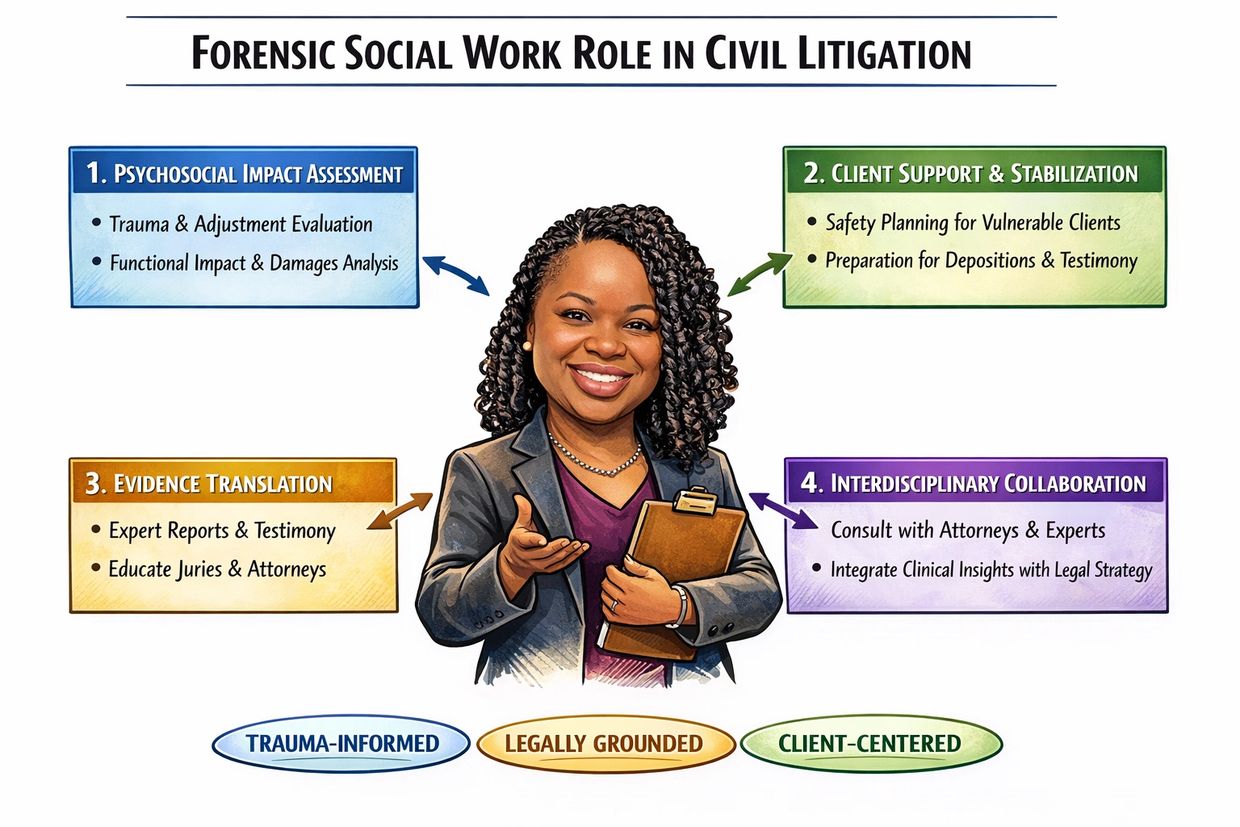 Her testimony educates judges and juries on trauma, systemic harm, behavioral health standards of care, and psychological impact — presented in clear, accessible language.